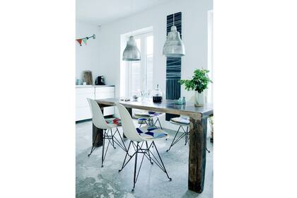 A pesar de los tonos grises y blancos, y los materiales fríos como el metal y el cemento, la composición logra un buen equilibrio con pequeños detalles como los almohadones sobre las sillas, la guirnalda en la pared y la planta sobre la mesa. | Foto: