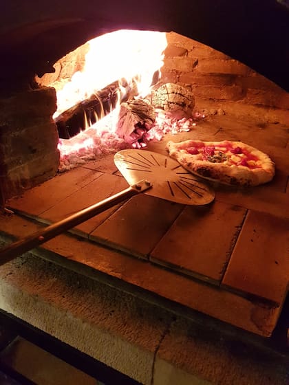 En el horno de barro, lo primero que se observa al ingresar al patio al aire libre, se encuentra Carola Santoro preparando las pizzas de estilo napolitano y manejando la pala con la habilidad natural de una experimentada maestra pizzera.