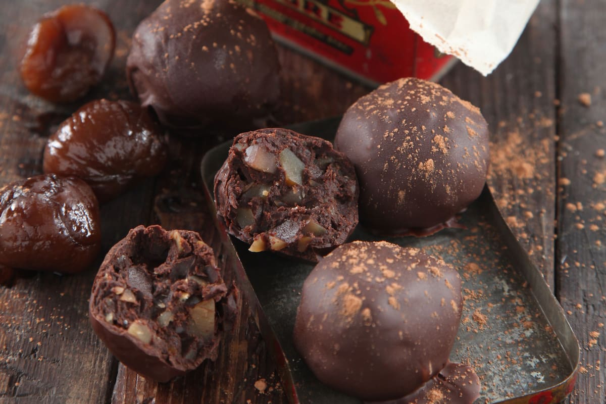 Picar las castañas. Derretir 100 g de chocolate junto con la manteca y la crema. Verter sobre las castañas, revolvler y llevar a la heladera durante dos horas. Formar bolitas de 10 g cada una. Derretir el resto del chocolate a Baño María o en el microondas. Pasar las bolitas por el chocolate y colocar sobre papel manteca. Llevar a la heladera y, una vez frías, espolvorear con el cacao.