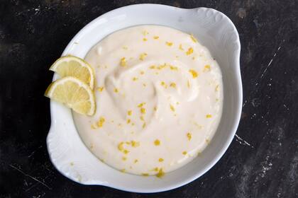 125 g de manteca; ralladura de 1 limón; 175 ml de jugo de limón; 300 g de azúcar; 1 taza de crema; ¼ cucharita de sal; 3 yemas y 3 huevos enteros.
