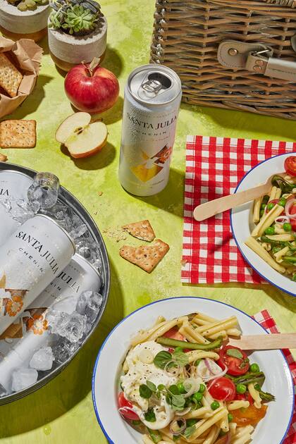 Picnic con una ensalada de pasta, verduras y burrata junto a la lata Santa Julia Chenin Dulce Natural