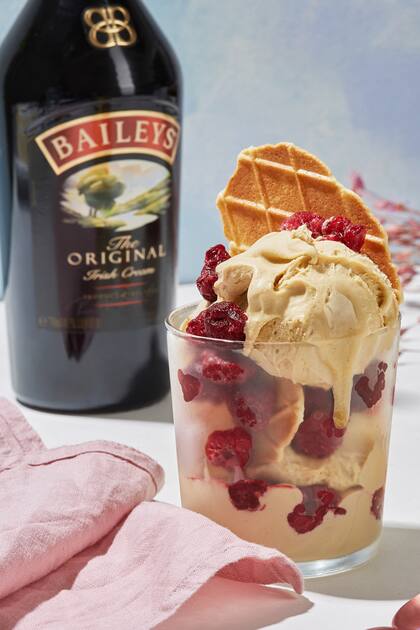 El calor del fin de año se lleva de maravillas con un buen helado de postre. Pero si a ese mismo helado le agregamos un par de secretos propios, cobra una nueva dimensión. Ahí es donde entra en juego el famosísimo Baileys, el licor crema número uno en el mundo. Mezcla del mejor whiskey irlandés y pura crema de leche, con aroma a chocolate y notas de vainilla, esta bebida es ideal para beber sola, con hielo, o como parte de un postre. En esta caso, la propuesta incluye un buen helado de vainilla, Baileys, frutos rojos (frutillas, arándanos, frambuesas) y la textura crocante de unas galletas.