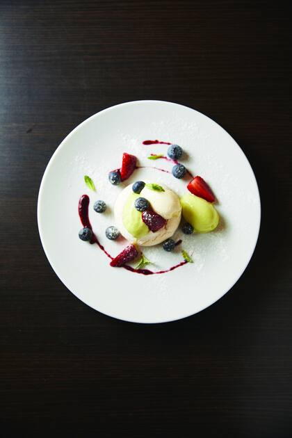 El plato: Vacherin de frutos rojos, helado de pistachos y chantilly.