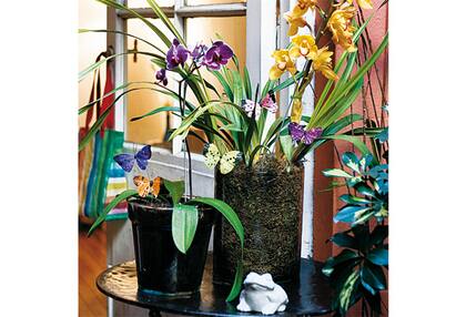 Maceta de vidrio con Phaleanopsis ($180, Chill Out); vaso con Cymbydium ($220, Chill Out); mariposas de tela ($5 c/u, Vero Farías); bolsa de compras multicolor ($30, D.ak); sapo de cemento ($140, La Mersa).