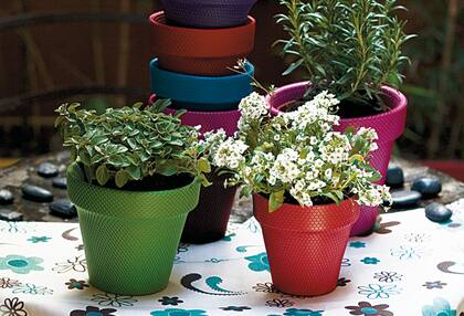 Maceta de 12cm ($24, Faurear) con orégano ($6, Faitful); maceta ($14, Faurear) con alisum ($2,20, Vivero Mario); maceta ($28, Faurear) con romero ($6, Faitful); pila de macetas ($14, Faurear). Mantel individual ($15, Porota).