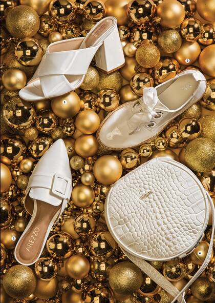 1. Sobre platino con solapa símil cuero (Blaquè). 2. Sandalia con tobillera y hebilla dorada (Prüne).3. Stiletto de cuero napa metalizado con base de goma (Lázaro). 4. Chata con glitter y hebilla dorada (Aldo, en Grimoldi)