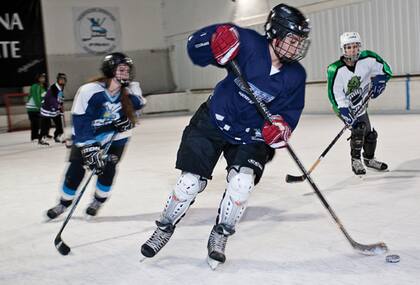 Son las nueve de la noche, es miércoles y la escuela de hockey sobre hielo para chicas está a punto de empezar. Antes de ingresar en la pista –Alpina, ubicada en el barrio porteño de Flores– ellas requieren de unos minutos para transformarse. El proceso no es sencillo ya que deben ocultarse bajo un sinfín de protectores. Las jugadoras llegan al hielo con el volumen de su cuerpo multiplicado: los pads, el casco y los guantes las protegen allí donde el acolchado de la indumentaria no puede. Todo el cuerpo está cubierto; el contacto es intenso y necesario.
