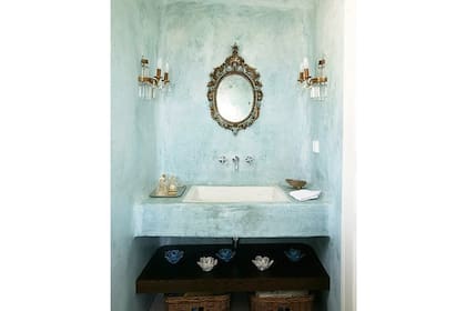 Rústico y a la vez delicado, este cuarto de baño está íntegramente revestido con cemento teñido de un tono celeste muy suave. | Foto: