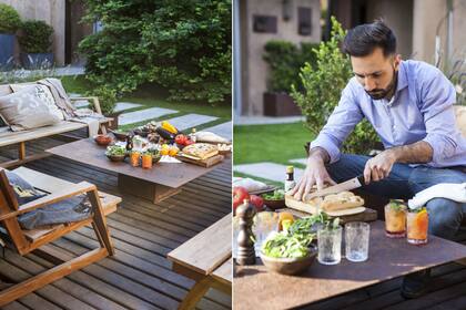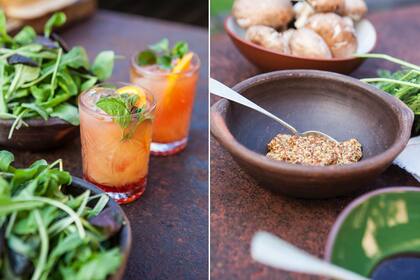 Para el primer brindis, un aperitivo estilo italiano con jugo, una rodaja de naranja, menta de la huerta y unas gotas de angostura: fresco y súper fácil de hacer. Como plato principal, sándwich de ojo de bife y vegetales a la chapa en focaccia casera de hierbas y ajo (Ott Almacén Gourmet). De postre, base de crema de pistacho con fruta fresca. Portamacetas de hierro efecto oxidado con piedras y suculentas (Liveout).
