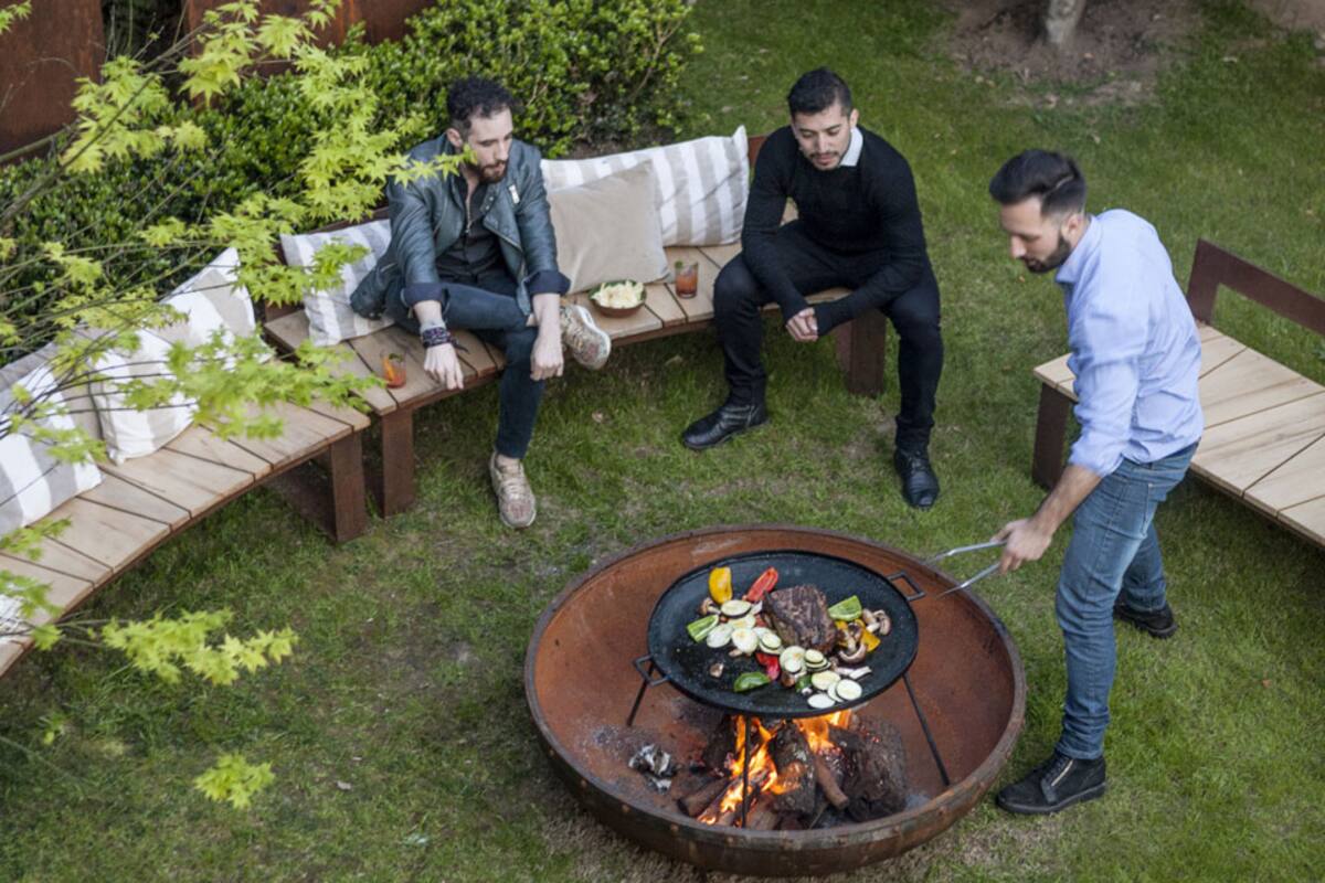 Fogón de chapa oxidada de 1,20m ‘El Canelo’ ($19.965), y paneles con motivo rupestre (todo de la línea ‘Livout’ del Estudio de paisajismo Stewart-Murray). Bancos curvos de hierro con asiento de madera (desde $27.225) y reposera (desde $16.940, todo de la línea ‘Simpla’ de Coelho & Coelho).