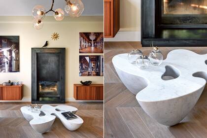PANORAMA. Las obras en este rincón son de Lumas, la galería que en los 90 inauguró el concepto de vender series limitadas de fotos artísticas, como éstas de Erich Lessing (basílica de Santa Sofía en Estambul) y Reinhard Görner (Palacio de Versalles). “Decidimos plastificarlas en lugar de colocarles vidrio y marco. Tan pronto como se enmarca una foto, queda ‘atrapada’, pierde la continuidad espacial. Este sector se logró usando distintos tonos de marrón, que bajan de las fotos a los muebles. La chimenea de piedra negra y la mesa de forma orgánica, también en piedra, contrastan por color y por ‘temperatura’, pero de modo que el equilibrio se mantiene”.