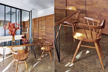 DISCRETA. “Escondimos los elementos funcionales de la cocina de dos maneras: con un armario de nogal hecho a medida y con una división de hierro y vidrio, esmerilado hasta media altura”, explica Anna Agapova. “Cuando la cocina no se usa, desaparece; lo que queda es un comedor diario con un clima encantador, elaborado con muebles vintage especialmente seleccionados para acomodarse al esquema de color”. La mesa es una réplica del clásico modelo del brasileño Joaquim Tenreiro; las sillas, originales ‘Captain’ del arquitecto norteamericano George Nakashima.