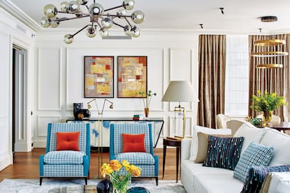 EN REUNIÓN. “En un ambiente tan amplio como éste, el color fue clave para darle calidez, pero también para integrarlo. Es muy fácil que los elementos queden ‘desconectados’ en grandes superficies si no se atiende a la proporción y a la paleta de color. En este caso, está basada en distintos tonos de azul, gris, rojo y beige, y recorre desde los textiles hasta el díptico de la artista rusa Olga Shagina”, explica Anna Agapova, directora de diseño de interiores del Estudio. Cortinas (Pepe Peñalver); luminarias (Arteriors); sillones turquesas (Amy Somerville); consola (Julian Chichester) y mesa baja espejada (Ochre).
