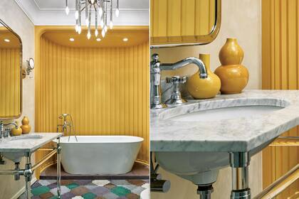 REFUGIO. “La protagonista indiscutida es la bañadera exenta dentro del nicho revestido en madera de un amarillo rico y profundo que transmite una agradable sensación de relax e ilumina el espacio desde adentro, un factor importante ya que este baño tiene poca luz natural. Este tono se lleva bien con el verde, el marrón, el violeta y el lila de los grandes cerámicos (ivanka.hu): una combinación audaz que refuerza lo escenográfico y lúdico de la propuesta”. Lámpara colgante (Jonathan Adler).