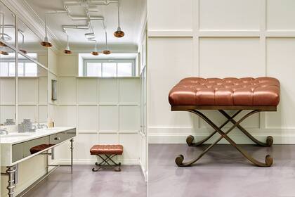 BRILLANTE. “En este caso, quisimos que la solución surgiera de la arquitectura y no de la decoración; entonces, llevamos el dibujo de las ventanas a las paredes para darles cierta plasticidad. Lo más llamativo, sin duda, es la luminaria (Ontwerpduo), que está entre la cañería y un gramófono vintage. Las patas del lavatorio, que diseñamos en el Estudio, refuerzan la geometría, mientras que el tapizado de la banqueta hace lo suyo con el leitmotiv metálico”.