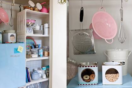 Apilando cajones de plástico reforzado ($100 c/u, Mascardi) se formó una práctica estantería. El detalle de lujo lo da la heladera retro con 76 litros de capacidad ($3.700, Whirlpool) que corresponde a una edición especial disponible en colores pastel. Pava rosada ($273), tetera de cerámica celeste (ambas de Reina Batata) y frascos carameleros ($22,90 Jumbo). || Para aprovechar el barral, se colocaron los tradicionales ganchos de acero ($15 x 2, Sodimac) que sostienen una tostadora ($21,99, Jumbo) y un colador rosa ($110, Reina Batata). Abajo, latas decoradas ($127, Karina Arc) y blanca ($95) y hielera ($170, ambas de Reina Batata).