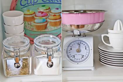En el cajón superior, dentro de una balanza de cocina ($240) se colocó una ensaladera metálica, elegida especialmente por su singular color rosado que se ajusta bien a la propuesta cromática. Al lado, un exprimidor de cerámica blanco ($60) sobre una pila de platos de uso diario (todo de Reina Batata).|| Los frascos de acrílico con tapa de cierre hermético ($39,90, Jumbo) vienen en diferentes tamaños y formas que permiten incluso apilarlos. Son ideales para guardar alimentos secos y evitar la imagen de desorden de paquetes cerrados o a medio terminar. Detrás, una bandeja metálica con motivo ‘Cup cakes’ ($56, Karina Arc).