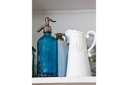 El amplio estante superior se aprovechó para los elementos de mayor tamaño y altura, como la jarra de cerámica vintage (Karina Arc) y, detrás, la jarra térmica celeste ($330 Reina Batata). El antiguo sifón de vidrio (Lo de Simona) aporta otro colorido detalle retro en contrastante azul, para cerrar el cuadro.