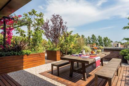 Con una superficie de casi 200m2, esta terraza aporta una magnífica dosis de verde y aire libre. El diseño de este espacio corrió por cuenta de Nicolás Rodríguez, del Estudio Paisaje. “Queríamos un jardín en altura que fuera variado y tuviera ejemplares de árboles, además de arbustos y plantas”. Sobre el deck de incienso, la parte más social de la terraza con un juego de comedor en pino tea.