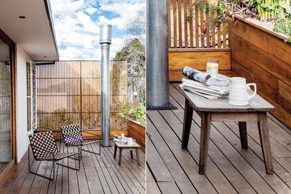 En esta terraza con pisos tipo deck y división de varillas de madera, se ubicaron dos reposeras bicolor de cashmilon trenzado, un diseño de Perlmutter para DAF Casa.