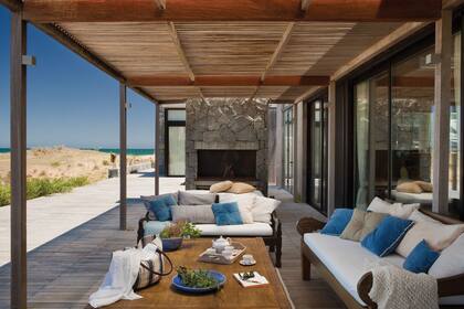 La galería que da al mar, ideal para los días sin viento o las mañanas, está semicubierta. La chimenea exterior en piedra de granito, los sillones blancos con almohadones en distintas texturas y la gran mesa de madera permiten aprovecharla hasta última hora, sin resignar las comodidades de un living. Sobre la mesa baja de madera, una bandeja de ratán con juego de té, cuencos azules de cerámica, bolso a rayas y túnica blanca.
