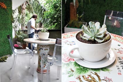 Esta terraza tiene como protagonista a la mesa de porcelana fabricada en dos piezas. Su presencia resultó tan imponente para los dueños de casa que apenas la complementaron con cuatro sillas de acrílico transparente diseñadas por Philippe Starck. Como centro, un tazón esmaltado en blanco. Tener la pared del balcón tapizada de enredadera te hace sentir en un jardín.