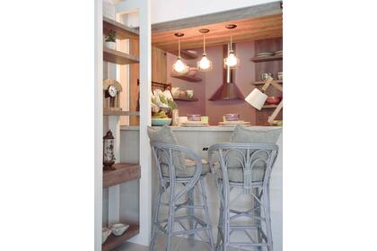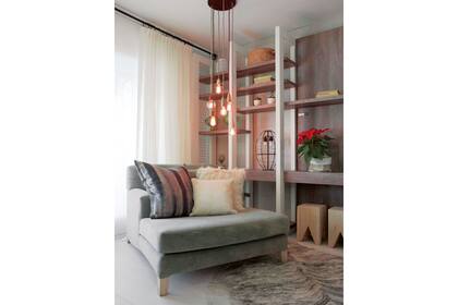 Patricia y Victoria Piña, de Las Churras, optaron por la pureza de los materiales nobles y las fibras naturales en este sector social con cocina integrada. Eligieron unas banquetas de mimbre con respaldo pintadas de gris y almohadones desflecados, que combinan con la pana lavada de algodón de la chaise longue de 1,20 x 1,40 m. Una biblioteca en melamina de dos colores integra los espacios (todo de Las Churras) que, además, se conectan mediante la elección de maderas claras y textiles especiales. La iluminación jugó un papel primordial con la lluvia de bombitas desde cables tejidos (PAR).