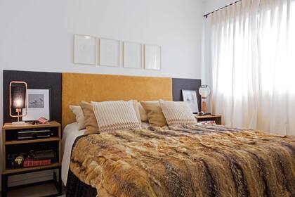 Para el dormitorio, los hermanos Pellegrini eligieron una cama con respaldo de paño de lana, combinado con cuero en el espacio donde se ubican las mesas de luz, de lapacho recuperado y base de hierro. La abrigan una manta de piel y almohadones tejidos. El arte en forma de obras en tinta y lápiz acompaña las intenciones del proyecto: "Generar un atmósfera marítima, sin caer en referencias literales o directas".