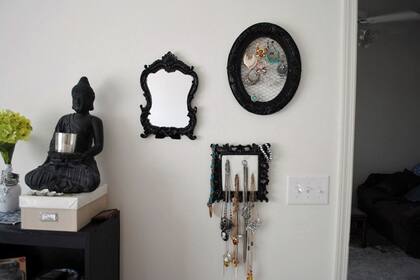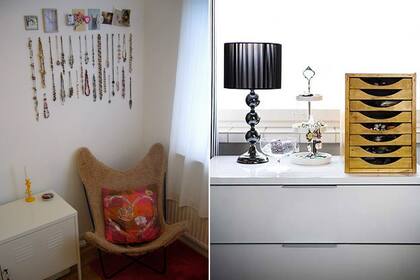 Por un lado, tenemos la opción de poner clavos en la pared y colgar todo, absolutamente todo, pero somos muchas las que no nos animamos - por más lindo que se vean en fotos como ésta. Otra idea es comprar una linda cajonera de madera y por dentro cubrir los cajones con tela de gamuza, así los accesorios no ruedan y permanecen en su lugar (fotos: Abeautifulabode + Emmas).