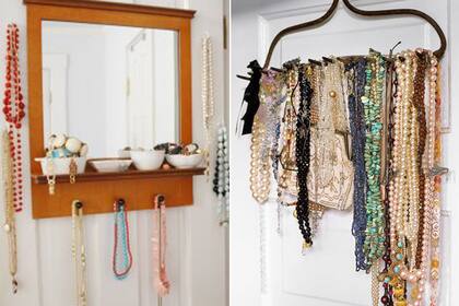 Un rastrillo viejo tiene la cantidad necesaria de ganchos para que podamos colgar todos nuestros collares. Un pequeño mueble con espejo, estante y ganchos detrás de una puerta resulta muy práctico (fotos: Photobucket + " TERCERA="" data-nodeType="link"> Littlegreennotebook).