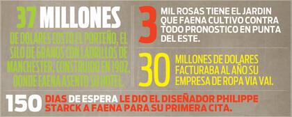 Con el sello de Starck, Faena atrae inversores, entre ellos, Len Blavatnik, uno de los hombres más acaudalados del planeta, según Forbes, y Austin Hearst, nieto del legendario Ciudadano Kane. Philippe llega con los primeros planos. Faena le habla de épica, de sangre, de pasión, del camino del guerrero, de las enseñanzas de Don Juan, de Castaneda, y le rebota seis veces los bocetos. Starck, raro en él, baja la cabeza, y un día anuncia: "Lo tengo". Y lo tiene.