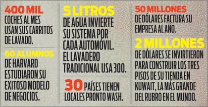 Pronto Wash llega a los 400 mil lavados al mes y tiene presencia en 30 países. Factura 50 millones de dólares al año –de los cuales sólo el 20 por ciento proviene del mercado argentino–. Tiene 400 unidades de lavado activas en todo el mundo. Inauguró 40 tiendas en Brasil y 50 en los Estados Unidos. Y batió un récord: el lavadero más grande del planeta, con una inversión de dos millones de dólares para instalar un local de tres pisos en la exclusiva Kuwait, donde los petrodólares abundan, los autos de alta gama están a la vuelta de la esquina, y donde el viento y la arena son aliados fieles para que todo lavadero tenga un buen pasar. El capital salió del bolsillo del socio de Pronto Wash en la zona, el Grupo Al-Wazzan, que comercializa productos de cocina, software y muebles para el hogar.