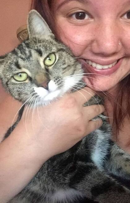 La humana y la gata se habían mudado recientemente a ese departamento en Lansing, Nueva York para que Schafer pudiera estar más cerca de la escuela de veterinaria en la Universidad de Cornell, donde cursaba su último año. Hacía cinco años que Schafer había rescatado a Kitty al costado de la autopista y, desde entonces, se habían vuelto inseparables.