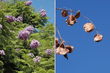 La floración más llamativa se produce sobre las ramas desnudas de hojas, en primavera. Las copas se cubren de corolas de un tono difícil de definir –entre celeste y lila–, que cambia según la mirada, la luz del momento, el fondo del cielo azul o encapotado y la expresión de los genes de cada ejemplar (porque las hay de color más intenso, casi azul violáceo). Existen también raros ejemplares de flores blancas. Los jacarandás se caracterizan por tener corola gamosépala (pétalos unidos), con un solo plano de simetría. Las flores se agrupan en panojas terminales erguidas. Tienen de 3 a 5 cm de largo y forma de tubo, con una pequeña curvatura. Son polinizadas por insectos y picaflores.