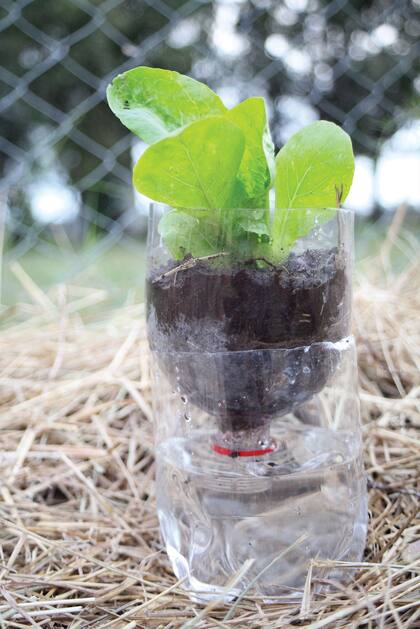 Cortar una botella de plástico por la mitad. La base se convertirá en el receptáculo del agua, mientras que la parte del pico será la maceta donde se ubicará el plantín. Poner agua en la parte inferior. Colocar sobre ella la parte superior de la botella, cubrir con tierra y plantar el plantín. El agua que está en la base permitirá mantener húmedo el sustrato.