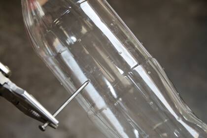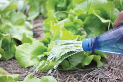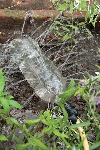 Esta es una alternativa al riego tradicional. Con una aguja para tejer, perforar la tapita de plástico de una botella en desuso. Volcar la botella llena, sumergir en la tierra a una profundidad de unos 3 cms y mantenerla firme. Hacer un agujero en el fondo de la botella para generar una entrada de agua.