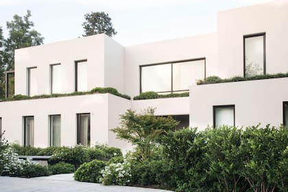 - La entrada a la casa recorre un espacioso sendero de cemento, suavemente escalonado y flanqueado por grandes maceteros, dispuestos así para elevar la vegetación. Azareros enanos (Pittosporum tobira ‘Wheeleri’) y jazmines del cielo blancos (Plumbago capensis ‘Alba’) consolidan la volumetría de los canteros.