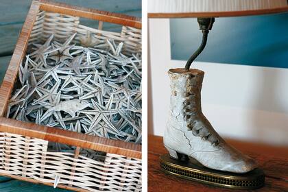 En los ambientes interiores se extrema esta pasión preciosista por darle a cada uno su identidad. Como ejemplos, el velador traído de Europa y el canasto con estrellas de mar de José Ignacio.