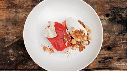 MEMBRILLOS CONFITADOS, HELADO DE CROTTIN, AVELLANAS Y RAPADURA