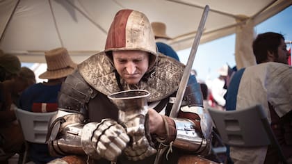 "Empecé a interesarme por el combate medieval después de ver unos videos por internet de una competición en Rusia –le dice Cristian Bernal a La Nación revista, luchador del mismo equipo–. Así que decidí viajar al torneo internacional de Faucon Noir, en Francia, para aprender a practicarlo. Lo que me atrajo en un principio fue la espectacularidad. Es un combate muy visceral. Pero lo que realmente me enganchó fue la comunidad que hay en torno a este deporte. Por encima de todo, priman unos valores que son el honor, la deportividad y el juego limpio. Y eso es algo que se ha perdido en muchos deportes. Como complemento también está la parte histórica y el reto tanto físico como psicológico que supone." La fuerza, obviamente, es fundamental en un deporte en el que los contrincantes tienen que vestir trajes que pueden llegar a pesar 30 kilos. Además, Cristian entrena técnicas de lucha con su club, formado por siete personas. Con él ha viajado un séquito formado por su personal de apoyo, entre los que se encuentran sus padres, Marcel –que, como él, es luchador– y Palmira –responsable de la organización del campamento–.