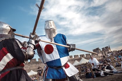 Un enorme campamento destaca a la entrada del recinto amurallado del castillo, una magnánima construcción de estilo gótico tardío que es el orgullo de la comarca. Miles de personas provenientes de distintos lugares del mundo se concentran en los 70.000 metros que abarca el recinto alrededor del castillo. Es una jornada de fiesta. Mujeres vestidas con blusa y falda larga cocinan carne sobre una fogata. Algunos hombres pasean con orgullo sus sayos y espadas, mientras otros ataviados con camisa, bombachas de campo y escarpines esperan a que comience el espectáculo en las barras donde los mesoneros sirven cerveza. Dentro de la liza, un cercado de madera que delimita el lugar donde se celebrarán los combates, un animador anuncia los equipos que se enfrentarán hoy. Cristian, uno de los luchadores que compiten esta tarde, espera para salir en una de las carpas situadas al lado de la zona de combate. Falta un rato para que empiece la pelea y aprovecha sus últimos minutos de concentración para repasar sus técnicas. Piensa que hoy tiene que salir y darlo todo. A su alrededor, el personal de apoyo que ha viajado con él revisa su armadura y lo ayuda a colocarse el casco.