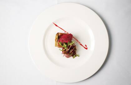 El plato: Foie, pato ahumado, pickles de remolacha y jengibre, y brioche de estragón