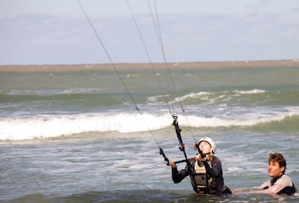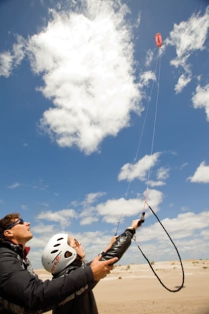 Primera etapa: morder la arena. El kitesurf es un deporte acuático pero el agua es lo último que se toca. Primero hay que caminar varias horas con el cuello torcido hacia el cielo tratando de que la cometa reaccione a alguna de nuestras órdenes. Romina, que desde hace bastante tiempo anda con ganas de encontrar un deporte de verano, se pone a la delantera y toma las líneas de un kite bebé como le indica Aldo. Hay que remontarlo, nada más que eso. Sube, sube, sube y pumba. Otra vez: sube, sube, sube y pumba. El gran barrilete cae hacia la derecha y hacia la izquierda como la aguja de una balanza. Hasta que escucho que grita "ah, ah, ya entendí, ya entendí", y algo sucede, porque antes de que el kite se vuelva a clavar en la arena, Romi hace una maniobra de muñeca y faaaaaaa, remonta de nuevo, y fiuuuuuu, vuela. "Yo quiero, yo quiero", pido, y lo mismo: primero la gran frustración, la torpeza y la caída. Después, la epifanía. El cuerpo empieza a entender de qué se trata todo esto: los brazos son el timón y se manejan solos, no hace falta que el cerebro intervenga.