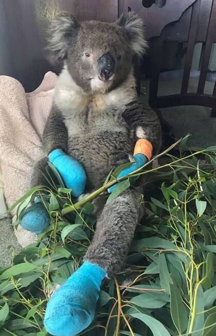Estaba tan débil que ni siquiera podía alimentarse por sus propios medios. Inmediatamente fue llevado a un veterinario, que revisó sus heridas, constató que tenía quemaduras graves en las cuatro patas, le administró antibióticos y calmantes y vendó las heridas. Lo llamaron Billy y, luego de esa visita, fue trasladado a la casa de Lucy y Adam Francis, que trabajan en 1300 Koalaz para ayudar a rescatar y rehabilitar a los koalas heridos.