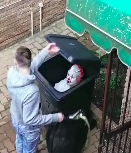 Maquillada y vestida como el diabólico payaso, la mujer se quedó agazapada un buen rato en el gran depósito de basura donde todos los vecinos dejan sus residuos. Jannie, por su lado, le pidió a Ruan que antes de irse a trabajar deje la bolsa de consorcio en el container. Al llegar, el joven dio con la sorpresa que le habían preparado.