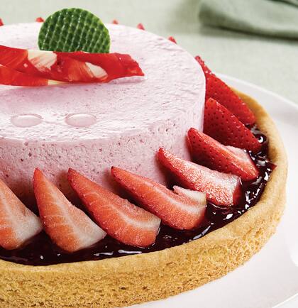 Desmoldar el disco congelado de mousse y pegar a la masa con una capa de dulce. Cortar las frutillas y acomodar alrededor de la mousse. Dar brillo con jalea y decorar con chocolate.