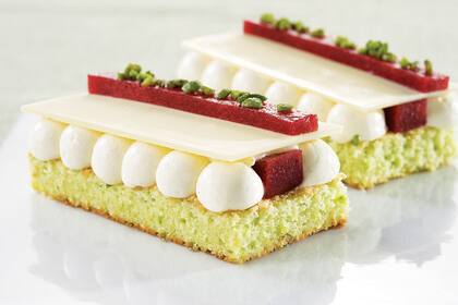 Lingote: batir las claras a punto merengue con el azúcar. Tamizar almendras en polvo, azúcar impalpable y harina. Mezclar la pasta de pistachos en el merengue en las últimas vueltas del batido. Retirar de la batidora e incorporar, a mano, los secos. Extender la masa en una placa (de 20x30x3 cm de altura) empapelada y enmantecada. Alisar, espolvorear con azúcar impalpable y hornear a 170°C por 20 a 25 minutos. Retirar y enfriar. Calentar la mitad del puré con el azúcar hasta disolverla. Agregar la gelatina hidratada con el agua y unir el resto de la pulpa. Homogeneizar y poner en un marco de 1 cm de altura. Enfriar y congelar. Batir la pastelera con la vainilla. Integrarle la crema batida a medio punto hasta obtener una crema sostenida. Colocar en manga con boquilla lisa. Cortar la masa en tiras de 4 x 10 cm. Armar con la crema y la gelatina cortada en barras. Decorar con una placa de chocolate blanco, pistachos y una tira de gelatina de frutilla.