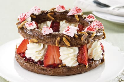 Batir la crema con el azúcar y la ralladura a punto chantilly. Distribuir el dulce en la base del anillo de masa. Intercalar frutillas y crema chantilly puesta en manga con boquilla rizada. Tapar y decorar con merengue seco.