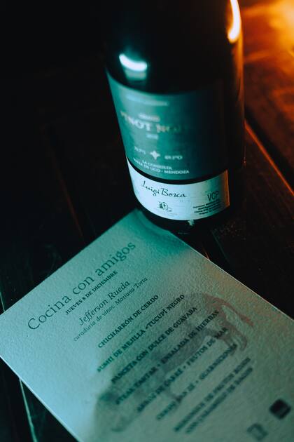 La gran estrella de la noche fue sin dudas el cerdo San Zé, el plato más emblemático de Jefferson Rueda. “Se basa en una receta muy antigua, que encontré y de la que finalmente logré hacer mi versión”, cuenta este cocinero. Es un cerdo de 100 kilos, deshuesado y cocinado por siete largas horas en una parrilla armada in situ especialmente para la ocasión, con muy pocas brasas de carbón que se fueron renovando de manera continua y a la vista de los comensales. A la mesa llegó junto con cuatro guarniciones de la cultura profunda de Brasil: un feijao de porotos negros, una farinha de harina de mandioca con cebolla y manteca, un salseado de kale y una ensalada de banana. En palabras de Vanesa, “estaba increíble”. Para beber, ahí brilló el Grand Pinot Noir 2018 de Luigi Bosca, con 50% de paso por barrica de roble francés.