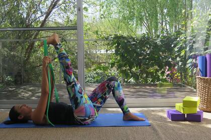 - Tomar un cinturón y colocarlo en el metatarso (ver foto) para elongar los músculos de la cara posterior de la pierna. Extender la pierna por completo. ¿Cuánto? 10 respiraciones por pierna.
